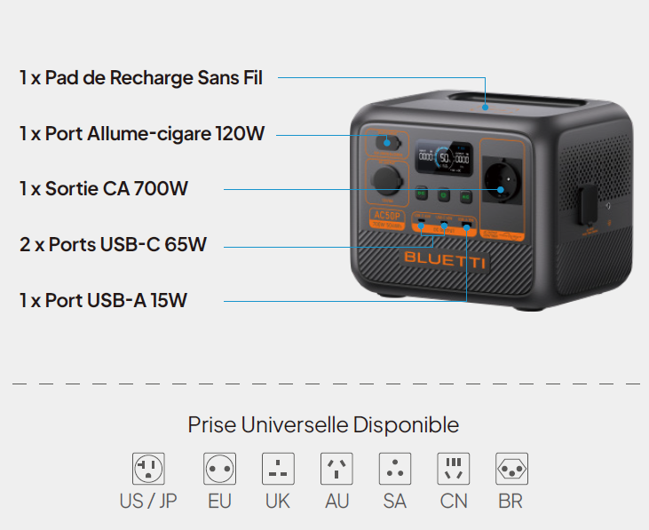 La BLUETTI Premium AC50 est une station d’énergie portable compacte conçue pour alimenter des appareils électriques en mobilité ou en secours domestique. Elle se positionne comme une solution polyvalente, silencieuse et durable, adaptée au camping, vanlife, chantier léger ou backup domestique.